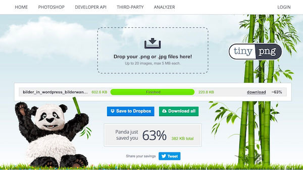 Ich nutze zum Komprimieren am liebsten den externen Dienst von tinypng.org. Eine Alternative sind jpegmini.com oder der deutschsprachige Dienst wepsitepanet.com/de. Jpgmini.com habe ich noch nicht ausprobiert, an Websiteplanet stört mich, dass die komprimierte Datei automatisch eine Dateierweiterung „_opitimized“ erhält.